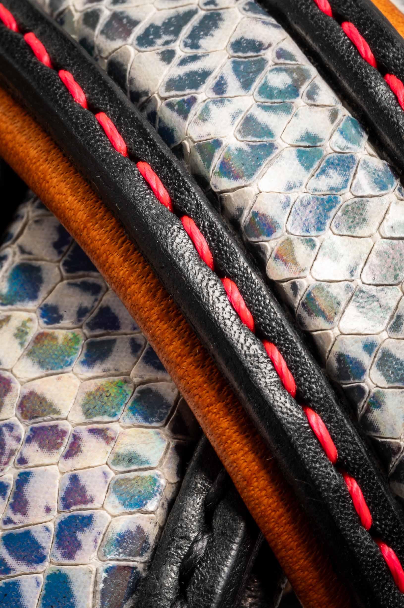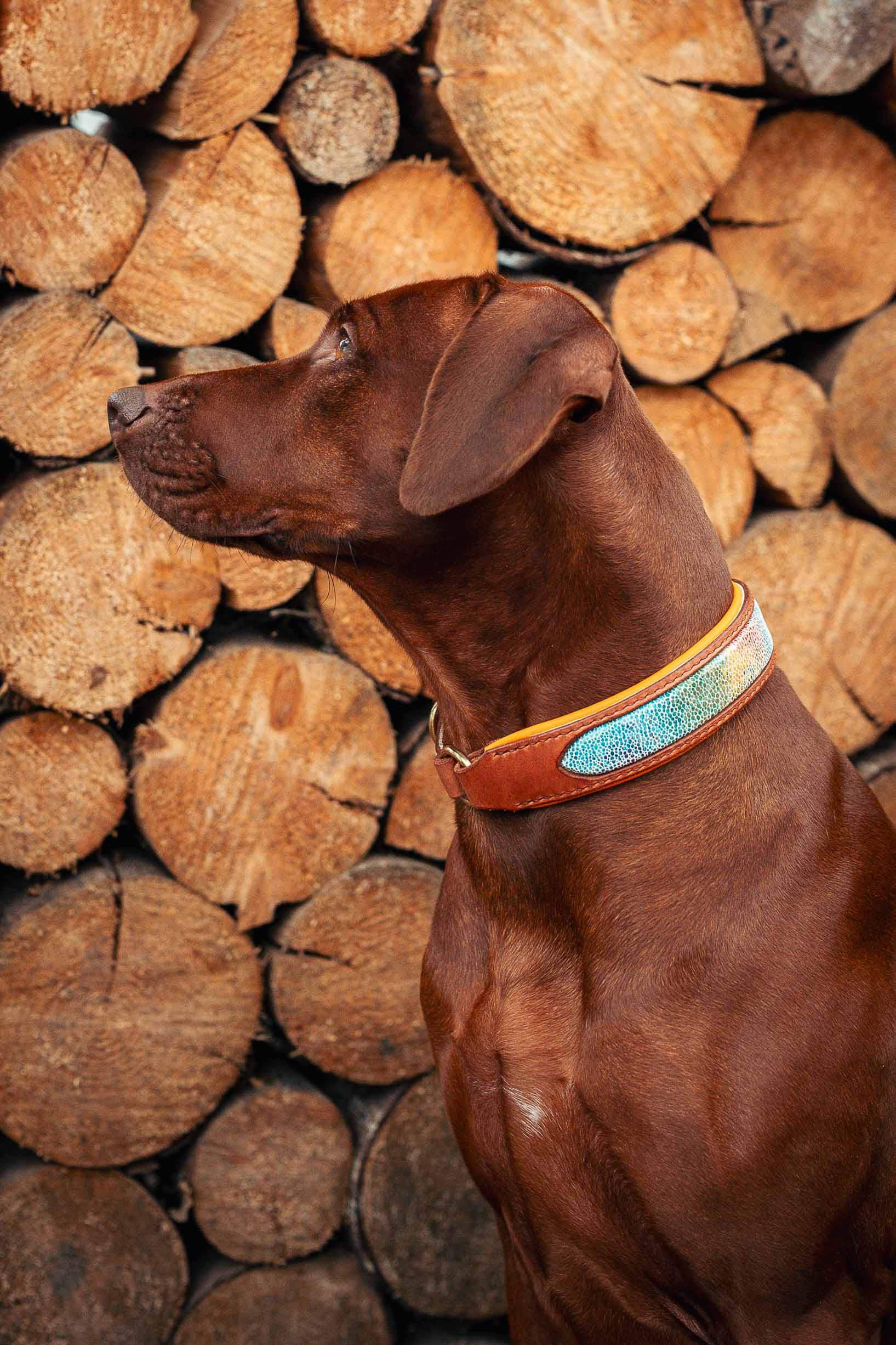 Limitiertes italienisches Designleder trifft maßgefertigtes Hundehalsband. Blank- Nappa- und Inlayleder sowie die Garnfarben sind frei kombinierbar. Erhältlich mit Zugstopp- oder Dornschnallenverschluss in Messing oder Edelstahl. Das ist die Essenz von CAjA.